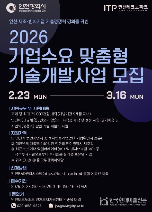 한국현대미술신문 박재남 기자 | 인천테크노파크(인천TP)는 지역 제조벤처기업의 기술경쟁력 강화를 위해 ‘2026년 기업수요 맞춤형 기술개발사업’의 참여기업을 오는 3월 16일까지 모집한다고 밝혔다.