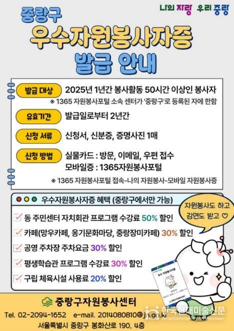 한국현대미술신문 배건 기자 | 중랑구가 자원봉사자의 헌신과 노고에 대한 예우를 강화하기 위해 ‘모바일 우수자원봉사자증’ 발급을 시행하고 다양한 혜택을 제공한다. 모바일 기반 발급 체계 구축과 함께 실질적인 인센티브를 내실화해 자원봉사 참여 동기를 높이고, 지역 내 자원봉사 문화 확산을 도모하기 위함이다.