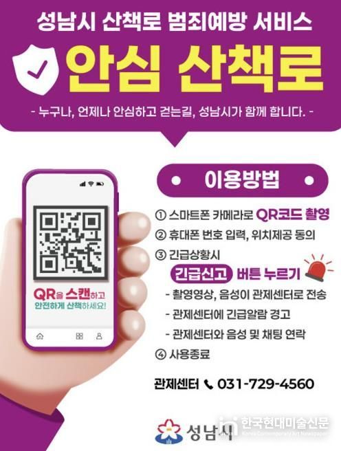한국현대미술신문 배윤섭 기자 | 성남시는 시민들이 보다 안심하고 산책로를 이용할 수 있도록 영장산과 불곡산 일대 산책로에 ‘범죄예방 서비스’를 6일부터 도입한다.