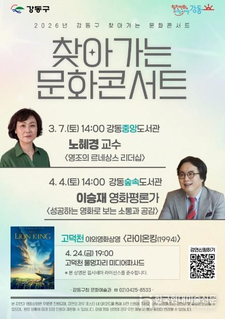 한편, '찾아가는 문화콘서트' 2회차는 오는 4월 4일 강동숲속도서관에서 열릴 예정이며, 영화평론가 이승재가 ‘성공하는 영화로 보는 소통과 공감’을 주제로 강연을 진행한다. 구는 다양한 분야의 전문가를 초청해 인문·예술 프로그램을 꾸준히 선보일 계획이다.