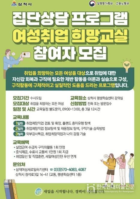 한국현대미술신문 원진 기자 | 삼척여성새일센터는 취업을 희망하거나 준비 중인 모든 여성을 대상으로 집단상담 프로그램 ‘여성취업 희망교실’ 참여자를 연중 수시 모집한다.