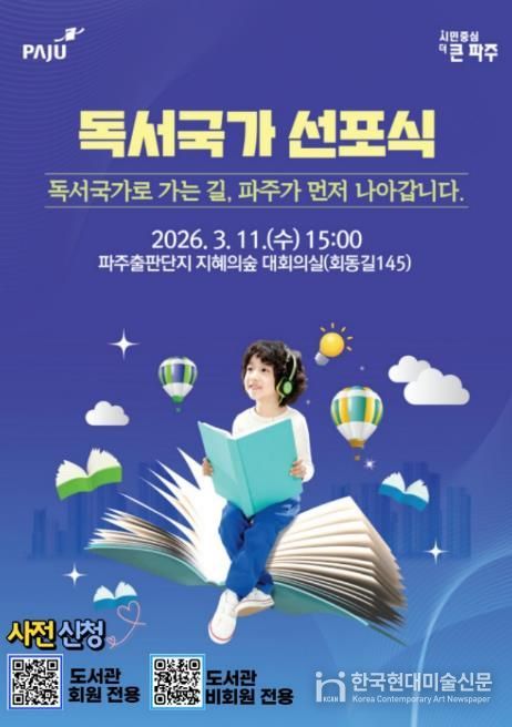 한국현대미술신문 배윤섭 기자 | 파주시는 오는 11일 15시, 파주출판도시 지혜의숲 대회의실에서 ‘파주시 독서국가 선포식’을 개최하고 책 읽는 도시를 넘어 ‘독서국가’로 나아가기 위한 힘찬 출발을 알린다.
