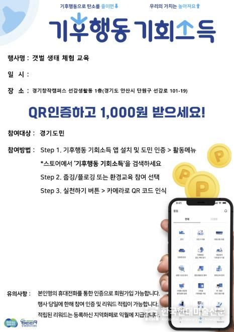 경기창작캠퍼스 ‘갯벌놀이터’는 매일 3회 유료로 참여할 수 있으며 자세한 운영 일정 및 이용 안내 사항은 경기창작캠퍼스 누리집에서 확인할 수 있다. 한편 '기후행동 기회소득' 지역화폐 리워드는 도내 주민등록을 둔 만 7세 이상 경기도민에 한해 지급된다. 아울러 3월 3일부터는 경기도 소재 대학(원) 재학생도 참여 대상에 포함되어 환경교육 참여가 가능하다. 세부 참여 기준 및 인증 절차는 경기환경에너지진흥원 '기후행동 기회소득' 사업 운영 지침에 따른다.