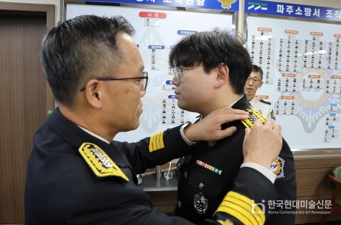 한국현대미술신문 배윤섭 기자 | 파주소방서는 5일 오전 9시 서장실에서 장기 근무와 성실한 직무 수행으로 근속승진한 소방공무원 8명에 대한 계급장 수여식을 열었다.