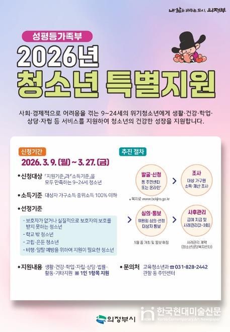 한국현대미술신문 배윤섭 기자 | 의정부시는 3월 9일부터 27일까지 ‘2026년 청소년 특별지원’ 사업 대상자를 모집한다.