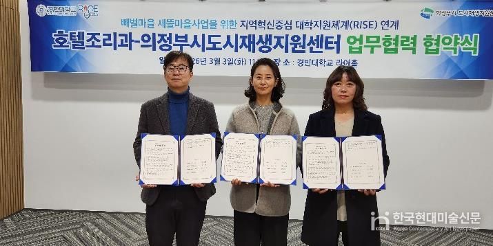 한국현대미술신문 배윤섭 기자 | 의정부시도시재생지원센터는 3월 3일 경민대학교 호텔조리과와 성공적인 빼벌새뜰마을사업을 위해 업무협약을 체결했다.