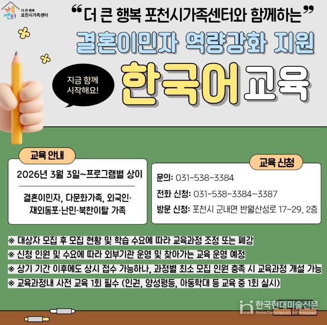 한국현대미술신문 배윤섭 기자 | 포천시 더 큰 행복 포천시가족센터는 2026년 결혼이민자 역량강화 지원 사업의 일환으로 한국어교육 과정을 수준별, 단계별 체계로 확대 개편하고 본격적인 운영에 들어갔다.
