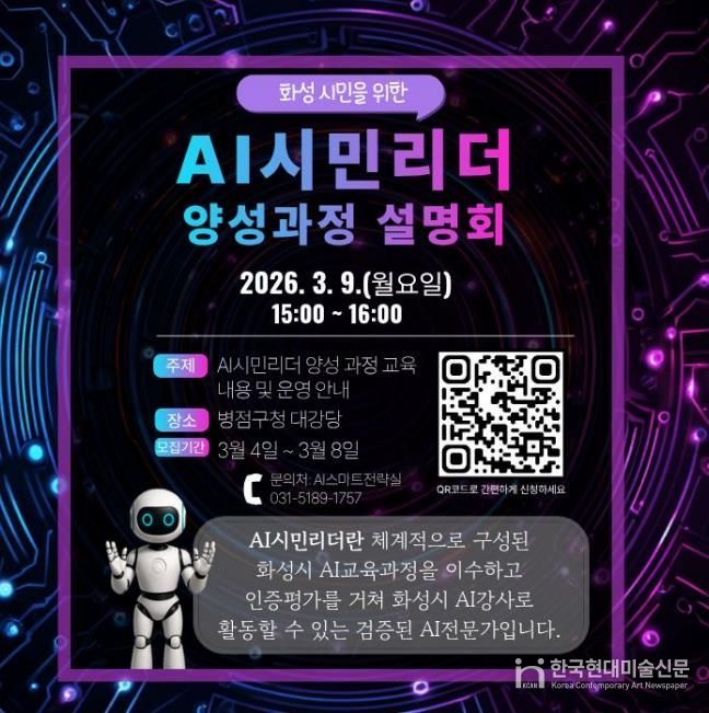 한국현대미술신문 배윤섭 기자 | 화성특례시는 시민이 학습하고 교육하는 인공지능(AI) 학습 체계 구축을 위해 ‘2026년 AI시민리더 양성 교육’ 설명회를 3월 9일 오후 3시에 병점구청 대강당에서 개최한다.