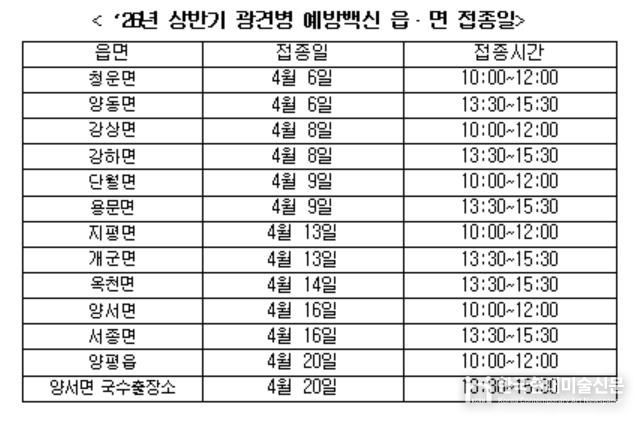 한국현대미술신문 배윤섭 기자 | 양평군은 오는 4월 6일부터 4월 24일까지 광견병 예방접종을 실시한다고 밝혔다.