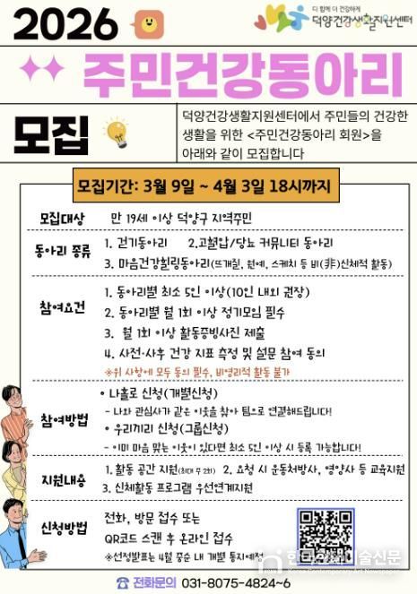 한국현대미술신문 배윤섭 기자 | 고양특례시 덕양건강생활지원센터가 지역주민이 주도하는 건강 행복 도시조성을 위해 ‘주민건강동아리’참여자를 모집한다.