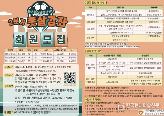 한국현대미술신문 배윤섭 기자 | 수원시청소년청년재단 칠보청소년청년센터는 지역 청소년들의 건강한 여가 생활과 체력 증진을 위해녪년 2분기 문화강좌(풋살 교실)’수강생을 모집한다고 밝혔다.