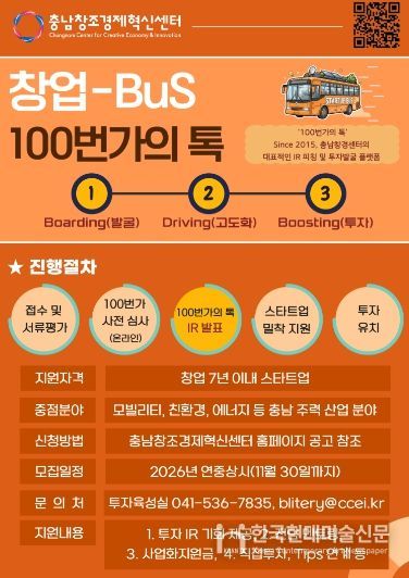 한국현대미술신문 신정은 기자 | (재)충남창조경제혁신센터가 지역 내 유망 스타트업의 신속한 발굴과 실질적인 투자 유치를 지원하기 위해 2026 창업-BuS ‘100번가의 톡’ 프로그램에 참여할 기업을 상시 모집한다고 밝혔다.
