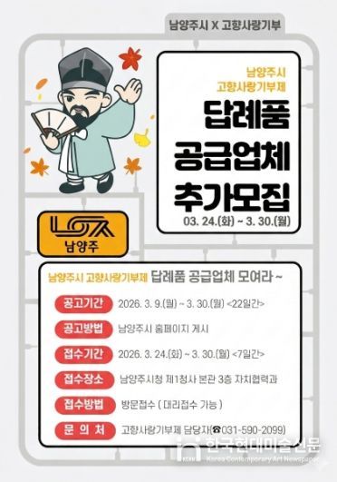 한국현대미술신문 배윤섭 기자 | 남양주시는 오는 3월 24일부터 고향사랑기부제 참여자들에게 제공할 ‘2026년 고향사랑기부제 답례품 공급업체’ 추가 모집 접수를 시작한다고 6일 밝혔다.