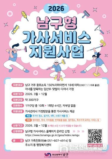 한국현대미술신문 정소영 기자 | 부산 남구는 임산부·맞벌이·다자녀 가정의 가사 부담을 완화하기 위해 '2026년 남구형 가사서비스 지원사업'을 3월 9일부터 시행한다고 밝혔다.