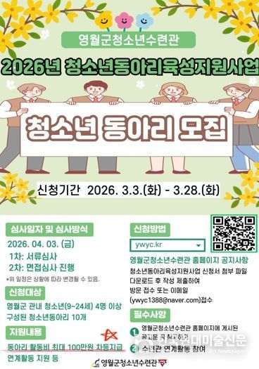 한국현대미술신문 원진 기자 | 영월군청소년수련관은 지역 청소년들의 자율적인 참여와 성장을 지원하기 위해 ‘2026년 영월군청소년수련관 청소년동아리육성지원사업’에 참여할 청소년 동아리를 모집한다.