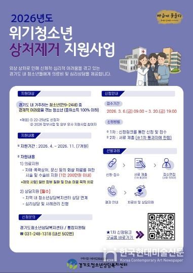 한국현대미술신문 배윤섭 기자 | 경기도가 자해 상처, 폭력 피해 문신 등으로 신체적·심리적 어려움을 겪는 청소년을 돕기 위해 오는 20일까지 ‘위기청소년 상처제거 지원사업’의 상반기 신청자를 접수한다.