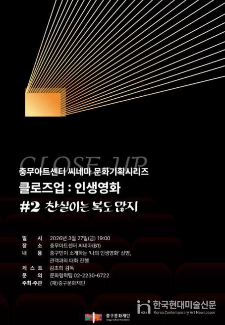 한국현대미술신문 배건 기자 | 서울 중구문화재단은 오는 3월 27일, 충무아트센터 씨네마에서 중구민이 직접 ‘나의 인생영화’를 소개하고 영화감독과 함께 대화를 나누는 '클로즈업 : 인생영화'를 개최한다.