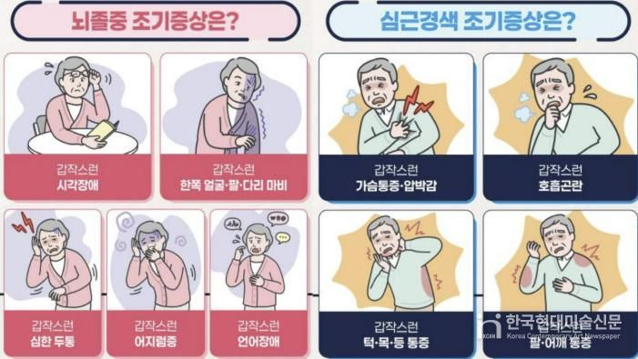 특히 이들 질환은 갑작스러운 마비, 언어장애, 심한 두통, 가슴 통증 등 증상이 갑자기 나타나는 것이 특징으로 이러한 조기증상이 발생하면 즉시 응급의료기관으로 이송돼야 하며, 치료가 빠를수록 회복 가능성은 높아지고 장애 발생과 사망 위험은 크게 낮아진다.