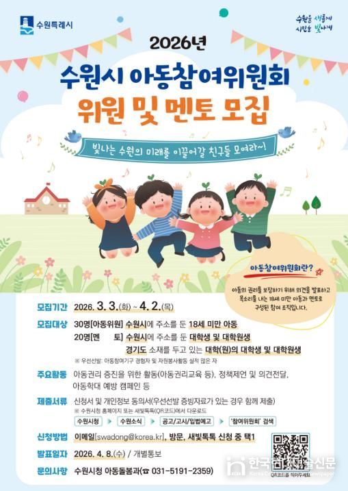 한국현대미술신문 배윤섭 기자 | 수원특례시는 ‘2026년 아동참여위원회’에서 활동할 아동 위원과 대학(원)생 멘토를 모집한다.