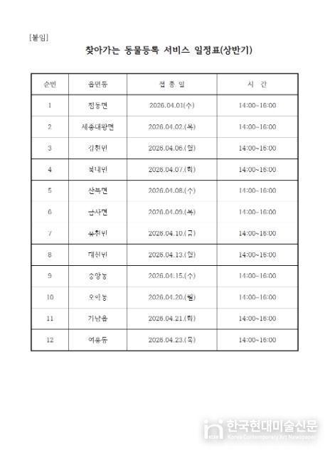 이번 서비스는 춘계 광견병 예방접종 기간에 맞춰 진행되며, 읍·면·동별 지정된 운영 일정(별첨)에 따라 행정복지센터 접수 창구를 방문해 신청서를 작성하면 된다. 동물등록은 외장형 무선식별장치를 부착하게 되며, 반려동물 소유주는 3,000원의 수수료를 납부하면 된다.