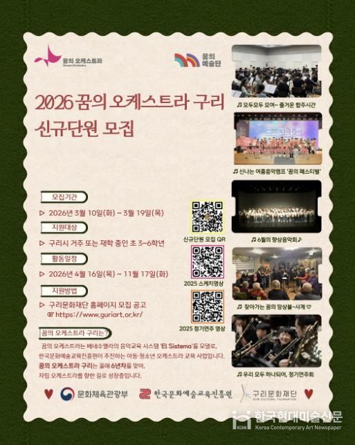 한국현대미술신문 배윤섭 기자 | (재)구리문화재단이 2026년 ‘꿈의 오케스트라 구리’에 함께할 신규 단원과 교육 강사를 공개 모집한다. 이번 모집을 통해 초등학교 3학년부터 6학년까지의 아동 약 10명과 분야별 교육 강사 13명을 선발할 예정이다.