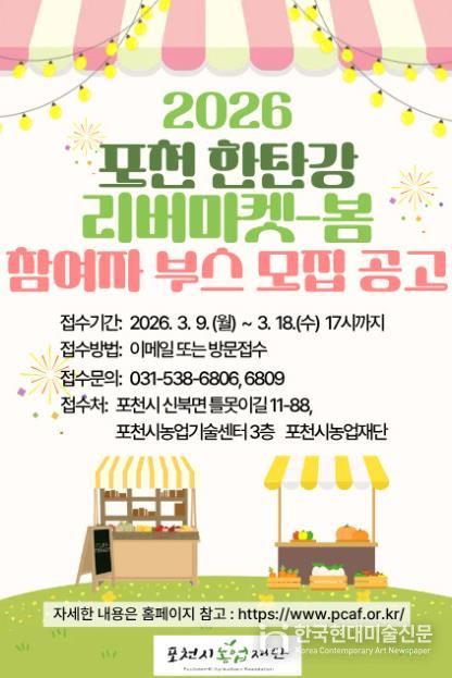 한국현대미술신문 배윤섭 기자 | 포천시농업재단은 오는 5월 한탄강 생태경관단지에서 열리는 ‘2026년 포천 한탄강 리버마켓-봄’ 행사에 참여할 부스 운영자를 공개 모집한다.