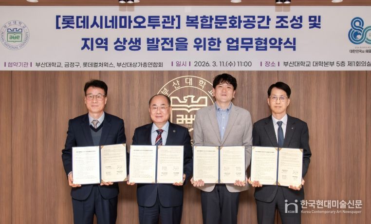 한국현대미술신문 정소영 기자 | 부산 금정구는 지난 11일 부산대학교 본관 5층 제1회의실에서 부산대학교, 롯데컬처웍스, 부산대상가총연합회와 ‘오투관’ 복합문화공간 조성 및 지역 상생 발전을 위한 업무협약을 체결했다.
