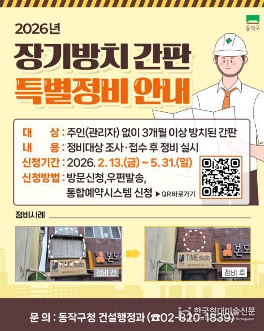 한국현대미술신문 배건 기자 | 동작구가 장기간 방치된 노후·위험 간판을 정비해 안전사고 예방 및 도시경관을 개선하고자 ‘장기방치 간판 특별정비 사업’을 추진한다고 밝혔다.