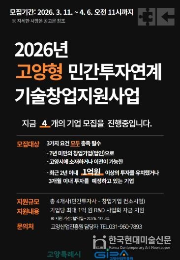 한국현대미술신문 배윤섭 기자 | 고양산업진흥원이 유망 기술창업기업의 투자 유치와 기술 고도화를 지원하기 위한 ‘2026년 고양형 민간투자연계 기술창업지원사업’에 참여할 창업기업을 모집한다.