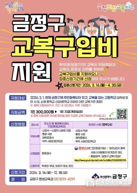 한국현대미술신문 정소영 기자 | 부산 금정구는 매년 관내 거주 고등학교 등 신입생에게 1인 30만원 교복구입비 지원사업을 추진하고 있다.