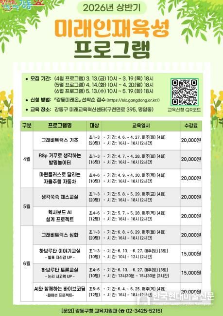 한국현대미술신문 배건 기자 | 서울 강동구는 초등학생의 창의적 사고력과 문제해결 역량을 키우기 위해 2026년 상반기 ‘미래인재 육성 프로그램’을 운영한다고 밝혔다.