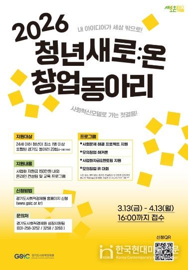 한국현대미술신문 배윤섭 기자 | 경기도사회적경제원이 4월 13일까지 일상 속 사회문제를 찾아 비즈니스 방식으로 해결하는 청년 창업 프로젝트 ‘청년 새로:온(溫) 창업동아리’ 20팀을 모집한다.