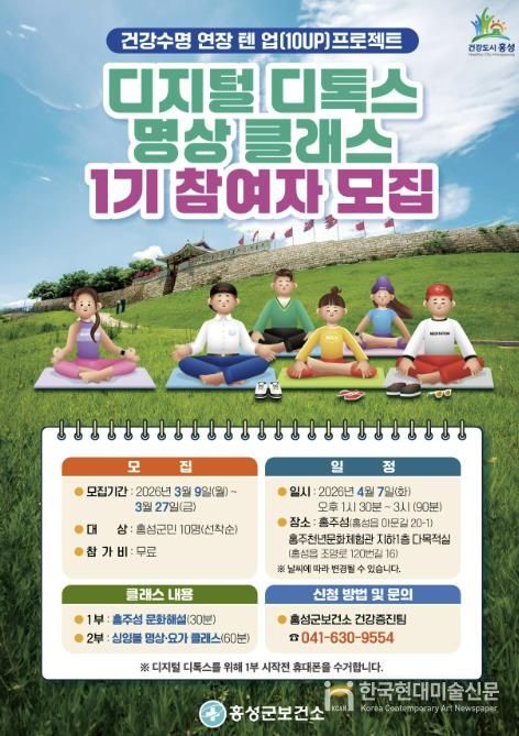 한국현대미술신문 신정은 기자 | 홍성군보건소는 지역주민의 정신건강 증진과 건강한 생활습관 형성을 위해 ‘건강수명 연장 텐업(10Up) 프로젝트’의 일환으로 디지털 디톡스 명상 클래스 1기 참여자를 모집한다.