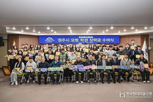 한국현대미술신문 원진 기자 | 원주시는 17일 오전 10시, 시청 지하 1층 다목적홀에서 귀뚜라미문화재단 장학금 및 장학증서 수여식을 개최하고, 예체능 분야에서 재능과 성장 가능성을 보인 지역 중·고등학생 50명에게 장학금을 전달했다.
