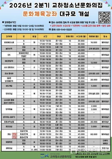 이와 함께 기존에 안정적으로 운영되며 높은 만족도를 보여준 ▲창의미술 ▲한자교실 ▲레고교실 ▲코딩 ▲생태교실 강좌 역시 지속적으로 운영되어, 청소년들에게 한층 더 넓고 깊이 있는 선택의 폭을 제공할 예정이다.