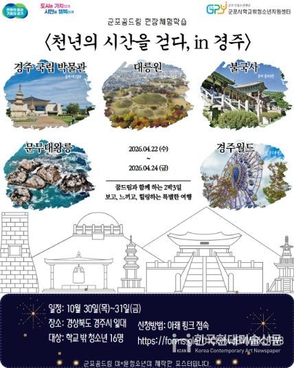 한국현대미술신문 배윤섭 기자 | (재)군포시청소년재단(대표이사 김덕희) 군포시학교밖청소년지원센터(센터장 강연미)는 학교 밖 청소년 16명을 대상으로 오는 4월 22일부터 24일까지 2박 3일간 경상북도 경주시 일대에서 ‘역사캠프 현장체험학습 프로그램’을 운영한다고 밝혔다. 참가신청은 구글폼 등을 통해 접수 받은 뒤 신청 내용을 바탕으로 참여 대상자를 선정할 예정이다.