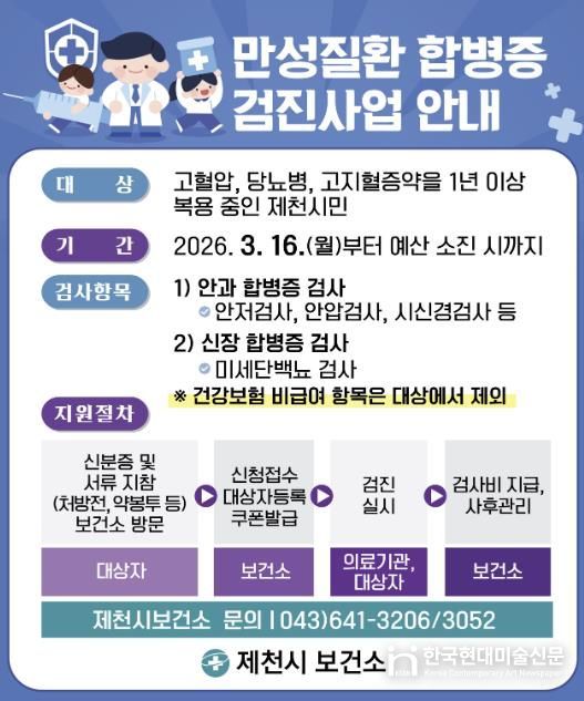 한국현대미술신문 신정은 기자 | 제천시보건소는 고혈압, 당뇨병 등 만성질환자의 합병증을 조기에 발견하고 중증질환으로의 진행을 예방하기 위해 ‘만성질환 합병증 검진 지원사업’을 추진한다고 밝혔다.