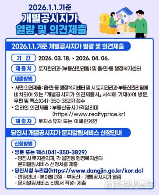 한국현대미술신문 신정은 기자 | 당진시는 3월 18일부터 4월 6일까지 20일간 2026년 1월 1일 기준 관내 35만 1,199필지에 대한 개별공시지가 열람을 실시한다고 18일 밝혔다.