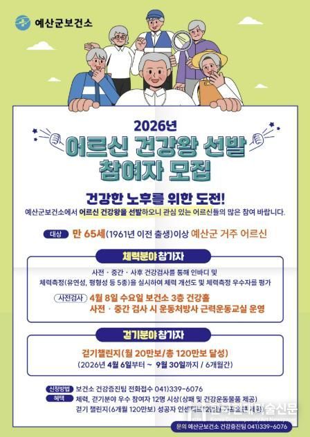 한국현대미술신문 신정은 기자 | 예산군보건소는 어르신의 자발적인 신체활동 참여를 유도하고 건강한 노후생활을 지원하기 위해 ‘2026년 어르신 건강왕 선발’ 참가자를 모집한다고 밝혔다.
