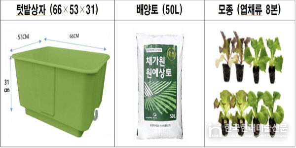 텃밭상자(66吱君cm), 배양토(50L), 모종(엽채류 8본), 사용설명서로 구성돼 있으며 서대문구 주민, 기관, 단체가 신청할 수 있다.