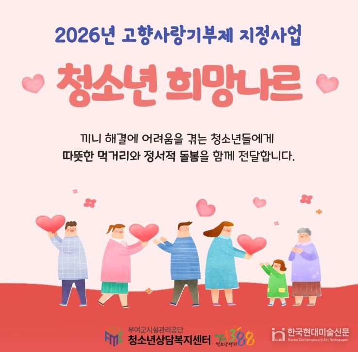 한국현대미술신문 신정은 기자 | 부여군시설관리공단 부여군청소년상담복지센터는 지역사회 기부금을 활용하여 돌봄 사각지대 청소년을 지원하는 고향사랑기부제 지정사업 '청소년 희망나르'를 추진한다고 밝혔다.