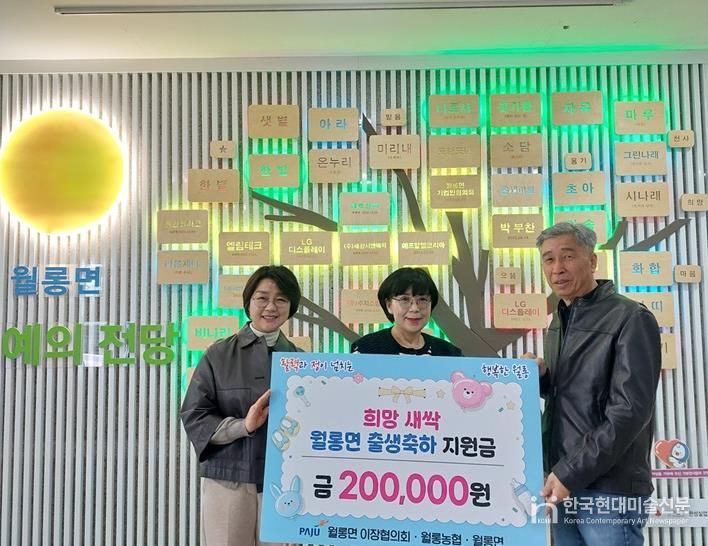 한국현대미술신문 배윤섭 기자 | 파주시 월롱면 이장협의회는 지난 17일 2025년 4분기 중 월롱면에서 태어난 출생아 가정에 1인당 20만 원의 ‘월롱 하나로마트 상품권’을 전달했다.
