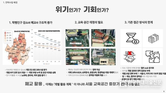 한국현대미술신문 배건 기자 | 서울특별시교육청은 학령인구 감소로 발생하는 학교 이전적지·폐교를 미래 역량 학습 거점으로 전환하는 중장기 교육 공간 구축 전략을 추진한다.