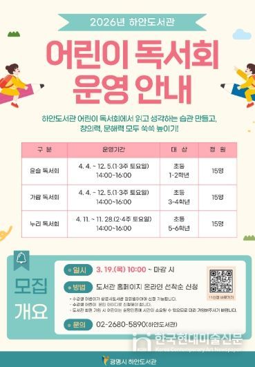 한국현대미술신문 배윤섭 기자 | 광명시 하안도서관은 어린이들이 올바른 독서 습관을 형성하고 기초 문해력을 기를 수 있도록 ‘2026년 어린이 독서회’ 참여 회원을 모집한다.