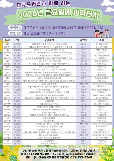 한국현대미술신문 정소영 기자 | 대구도서관은 시민들에게 최신 과학기술과 연구 성과를 쉽고 흥미롭게 전달하기 위해 ‘2026년 금요일에 과학터치’ 프로그램을 본격 운영한다.