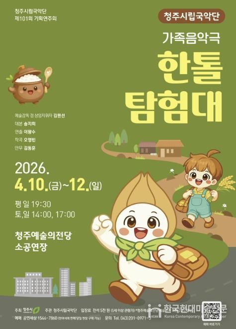 한국현대미술신문 신정은 기자 | 청주시립국악단은 4월 10일부터 12일까지 3일간 청주예술의전당 소공연장에서 제101회 기획연주회 가족 음악극 ‘한톨탐험대’를 개최한다고 19일 밝혔다.