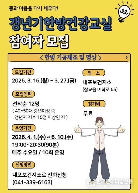 한국현대미술신문 신정은 기자 | 예산군 내포보건지소는 갱년기 증상으로 어려움을 겪는 중년 여성의 건강 증진과 삶의 질 향상을 위해 2026년 ‘갱년기 한방건강교실’ 프로그램을 운영한다.