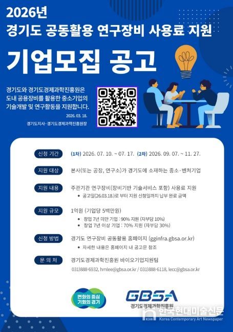 한국현대미술신문 배윤섭 기자 | 경기도와 경기도경제과학진흥원이 도내 중소·벤처기업의 연구개발(R&D) 경쟁력 강화를 위해 ‘2026년 경기도 공동활용 연구장비 사용료 지원 사업’을 추진한다.