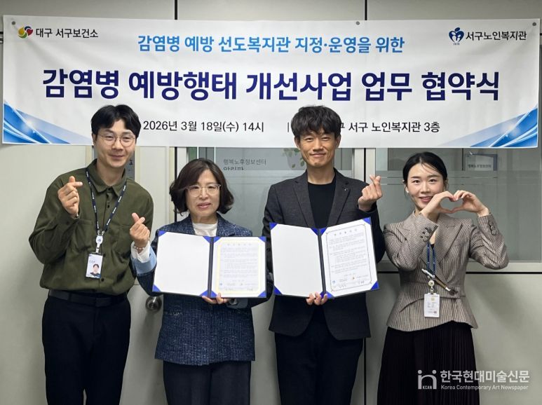 한국현대미술신문 정소영 기자 | 대구 서구보건소는 18일, 서구노인복지관(사회복지법인 가정복지회)을 ‘감염병 예방 선도복지관’으로 지정하고, 원활한 운영을 위한 업무협약을 체결했다.