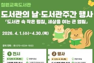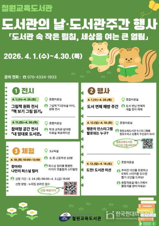 한국현대미술신문 원진 기자 | 철원교육도서관은 4월 12일 도서관의 날과 4월 12일부터 18일까지의 도서관 주간을 맞아 도서관 이용자와 지역 주민들을 대상으로 도서관의 날·도서관 주간 행사를 운영한다.